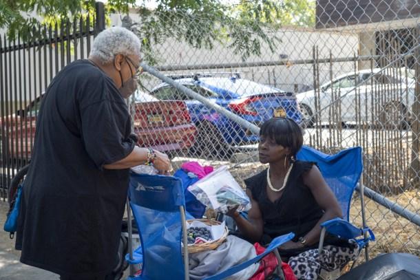 Poor People’s Campaign advocate Faye Wilson Kennedy distributes hygiene supplies to Von, an unhoused person living on X Street.