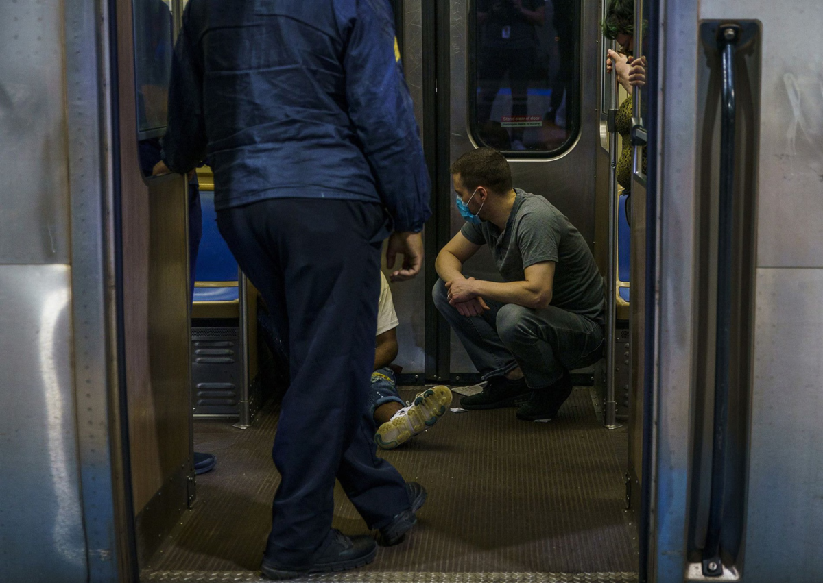 A doctor talks with a rider who was given the opioid overdose antidote Narcan after the man was found unresponsive on a train in Chicago in May 2022.