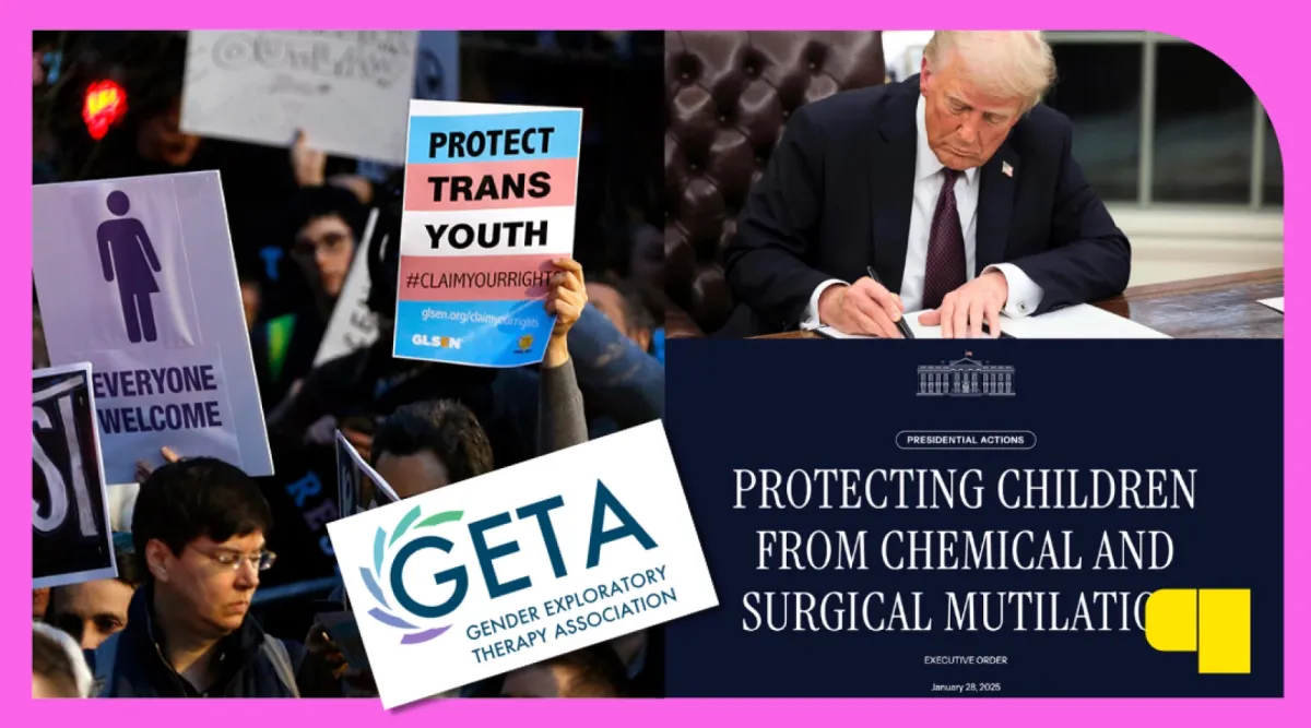 A collage of photos showing people rallying for trans rights, the Gender Exploratory Therapy Association logo, and Trump signing anti-trans executive orders.