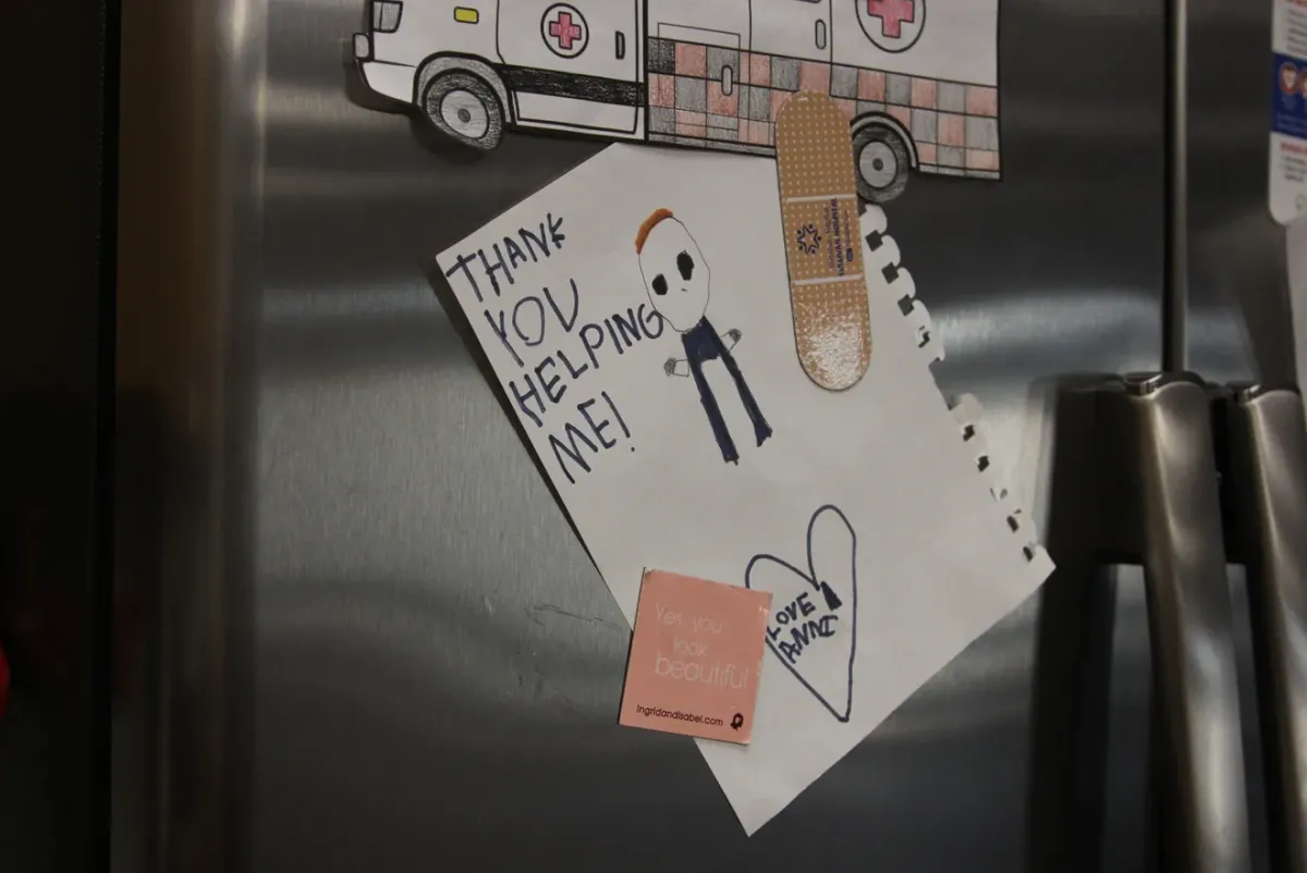 A thank you note from a patient hangs on a fridge at the Washington County Ambulance District Headquarters on Sept. 30, 2025.