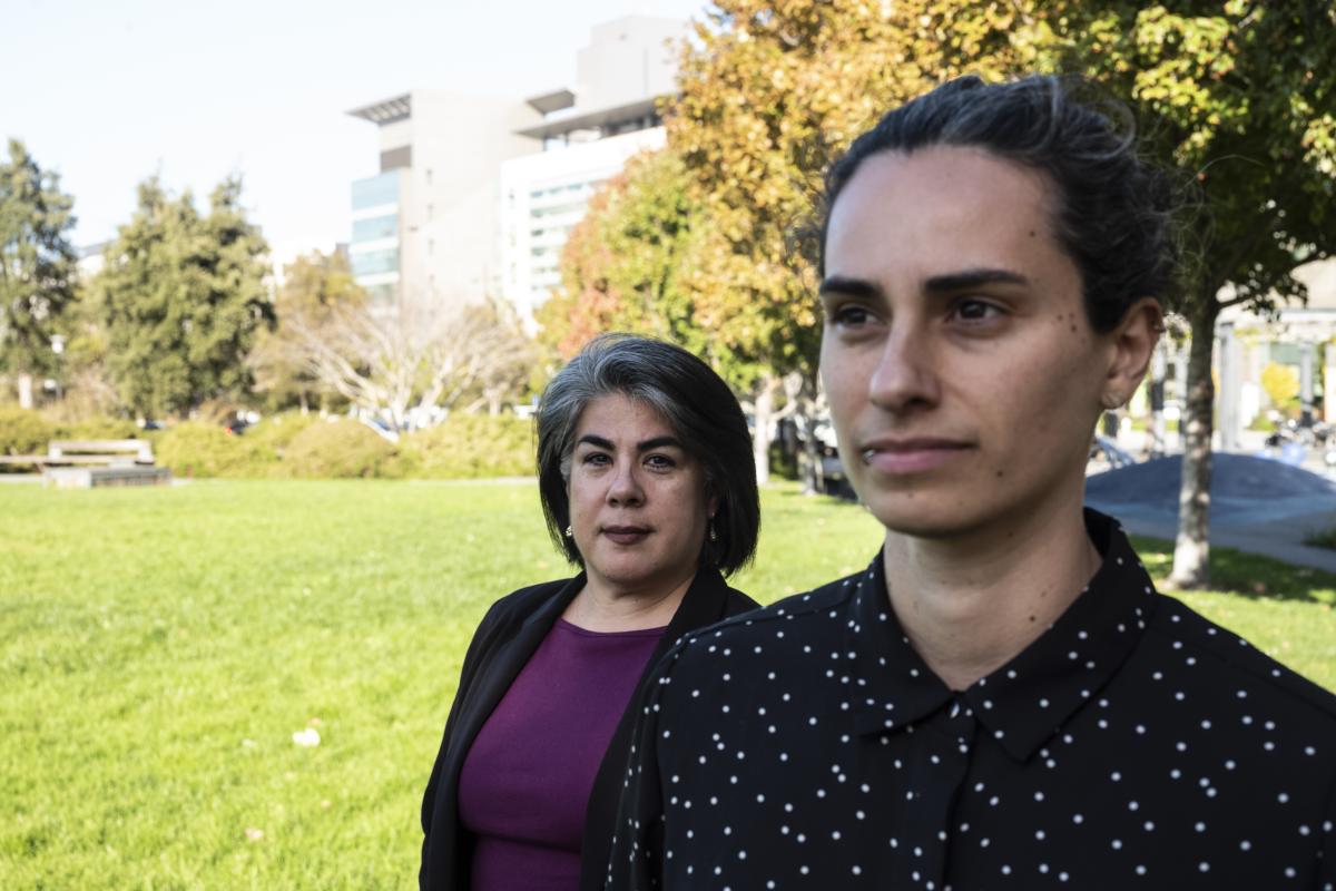 Medical interpreters Sarah Roberts, 34, and Isela Galvez Tovar, 54, of the University of California, San Francisco (UCSF), stand at Mariposa Park in San Francisco on Nov. 6, 2025. Amid UCSF’s hiring freeze and growing burnout among Spanish-speaking interpreters, workers are preparing to strike. Photo: Pablo Unzueta for El Tecolote / CatchLight Local