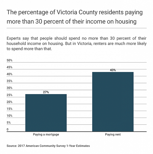Although Texas frequently ranks among the nation’s cheapest states to live, Victoria’s low-wage renters sometimes found themselves competing with out-of-town oil field workers for housing years before Harvey struck. In recent years, almost half of all renters were considered “rent burdened,” which means they spend more than 30 percent of their income on rent, according to census estimates. Yet despite those trends, local government leaders made limited attempts to address those problems.